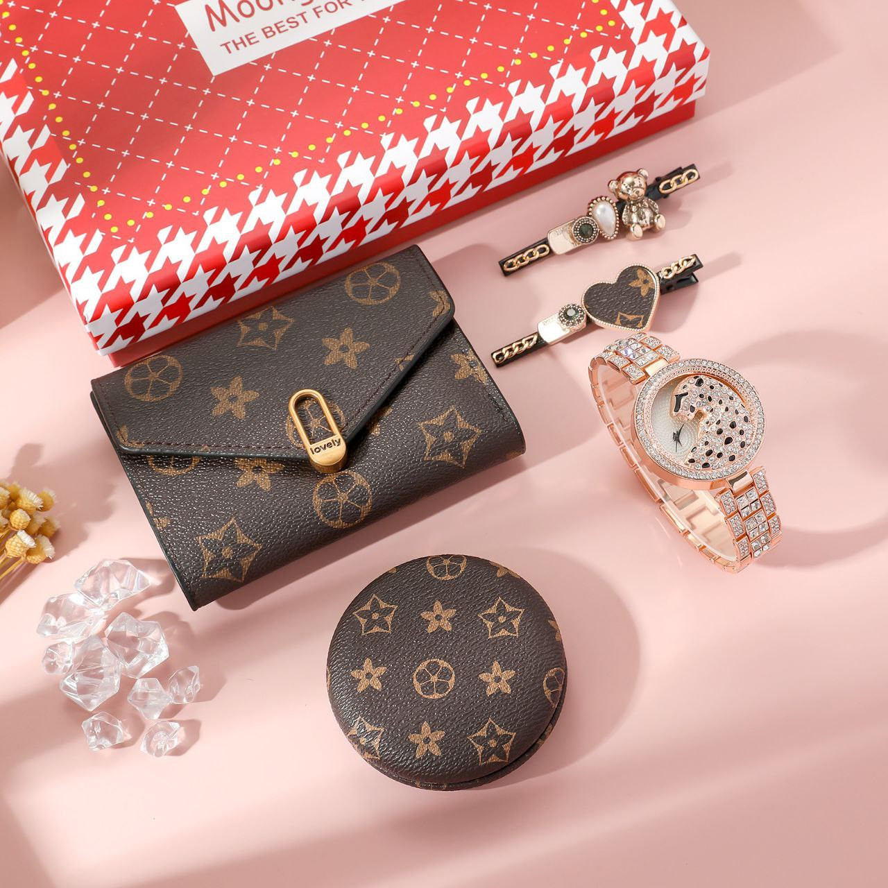Coffret cadeau de montre pour femme 5 pièces/ensemble, montre à la mode et simple + portefeuille + clip + couvercle de miroir cosmétique
