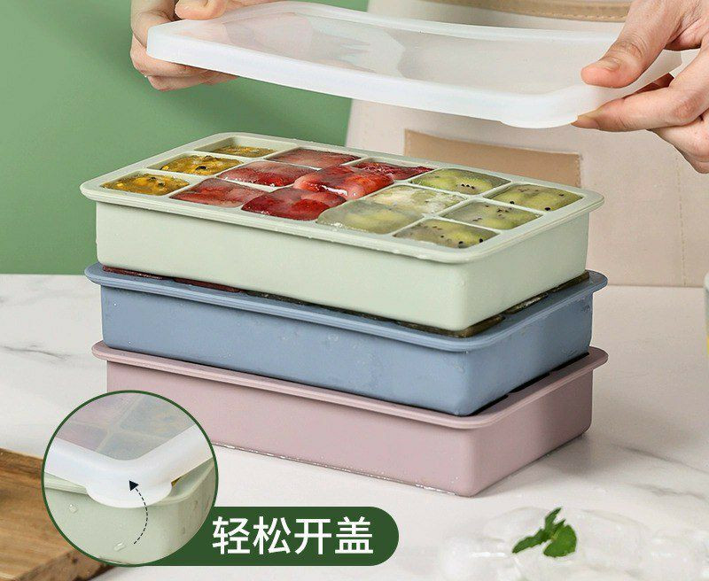 Bacs a glaçon avec couvercle en silicone, glace Grid Ice Cube Moule facile à libérer complémentaire Grille avec couvercle Silicone Baby Ice Box