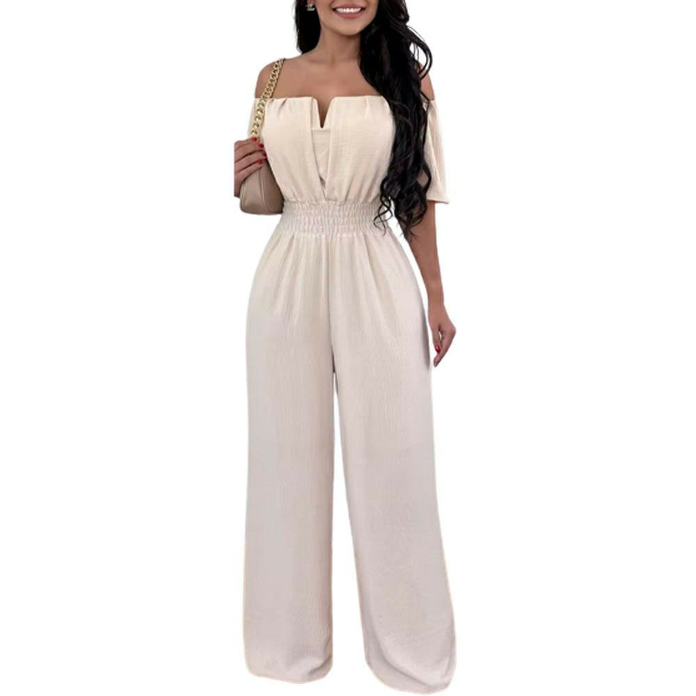 Combinaison longue pour femmes, mode épaules dénudées décontracté plaine manches courtes taille froncée quotidien longue jambe large combinaison 2025