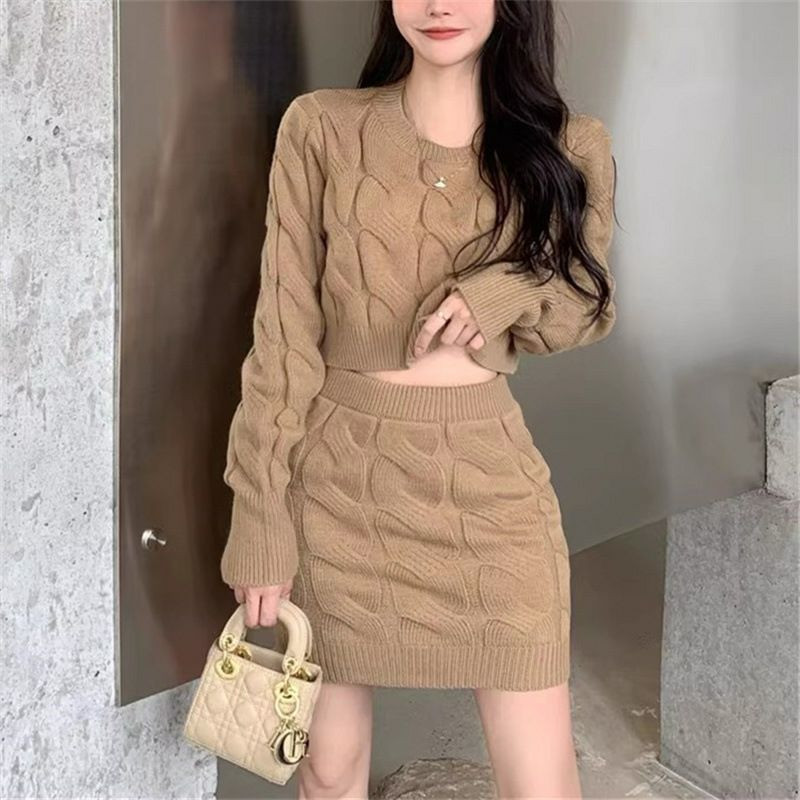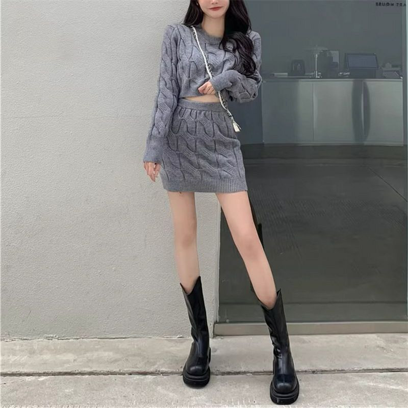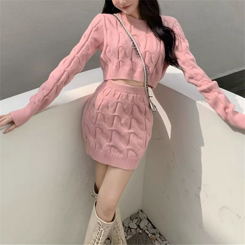 Ensemble de vêtements Tricoté 2 Pièces pour Femmes, Couleur Unie, Col Rond, Manches Longues, Pull Court, Mini Jupe sexy, class, décontracté, tendance