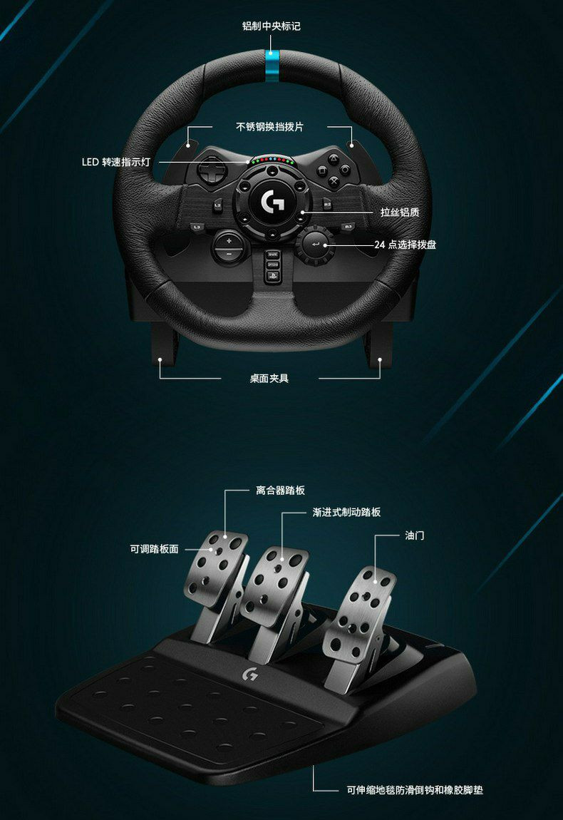 Le pédalier inclus possède trois pédales (accélérateur, frein, embrayage) et une pédale de frein progressive qui simule un système de freinage sensible à la pression.